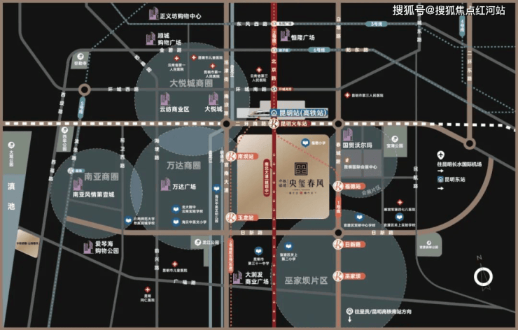 交通配套:项目处于二环南路、春城路、官南大道、日新东路围合处,周边城市路网建设较为成熟,项目500米内有福昌路口、福达路口(官南大道)、锦苑花园(官南大道)等多个公交站,项目约300米范围内有1号线福德站、昆明火车站,未来还将有2号线(在建)的南坝站、玉龙站。项目北侧约600米处就是昆明火车站