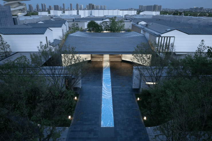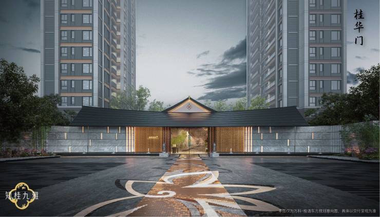 特色铺装折桂路延伸至中式贵气桂华门。金属瓦屋面的坡屋顶,搭配海蓝宝石材装贴,尽显高贵与典雅。